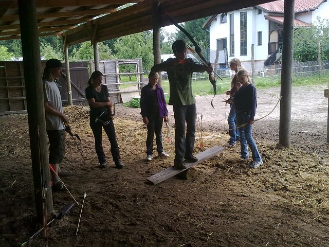 2 Übungsleiter kümmern sich während des Trainings, das in wechselnden Gruppen stattfindet, um die einzelnen Bereiche Bogen zu Fuß, Pferd ohne Bogen, Pferd mit Bogen sowie Training der einzelnen Wettkämpfe.